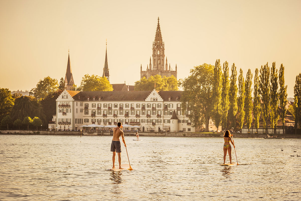 Konstanz ist die größte Stadt am Bodensee und liegt direkt an der schweizerischen Grenze. Sie ist mittlerweile mit der schweizer Nachbarstadt Kreuzlingen zusammengewachsen, so dass die Staatsgrenze mitten zwischen einzelnen Häusern und Straßen hindurchgeht. Auf der südlichen Rheinseite liegt eine wunderschöne historische Altstadt und der Stadtteil Paradies, das einzige Gebiet Deutschlands südlich des Bodensees.